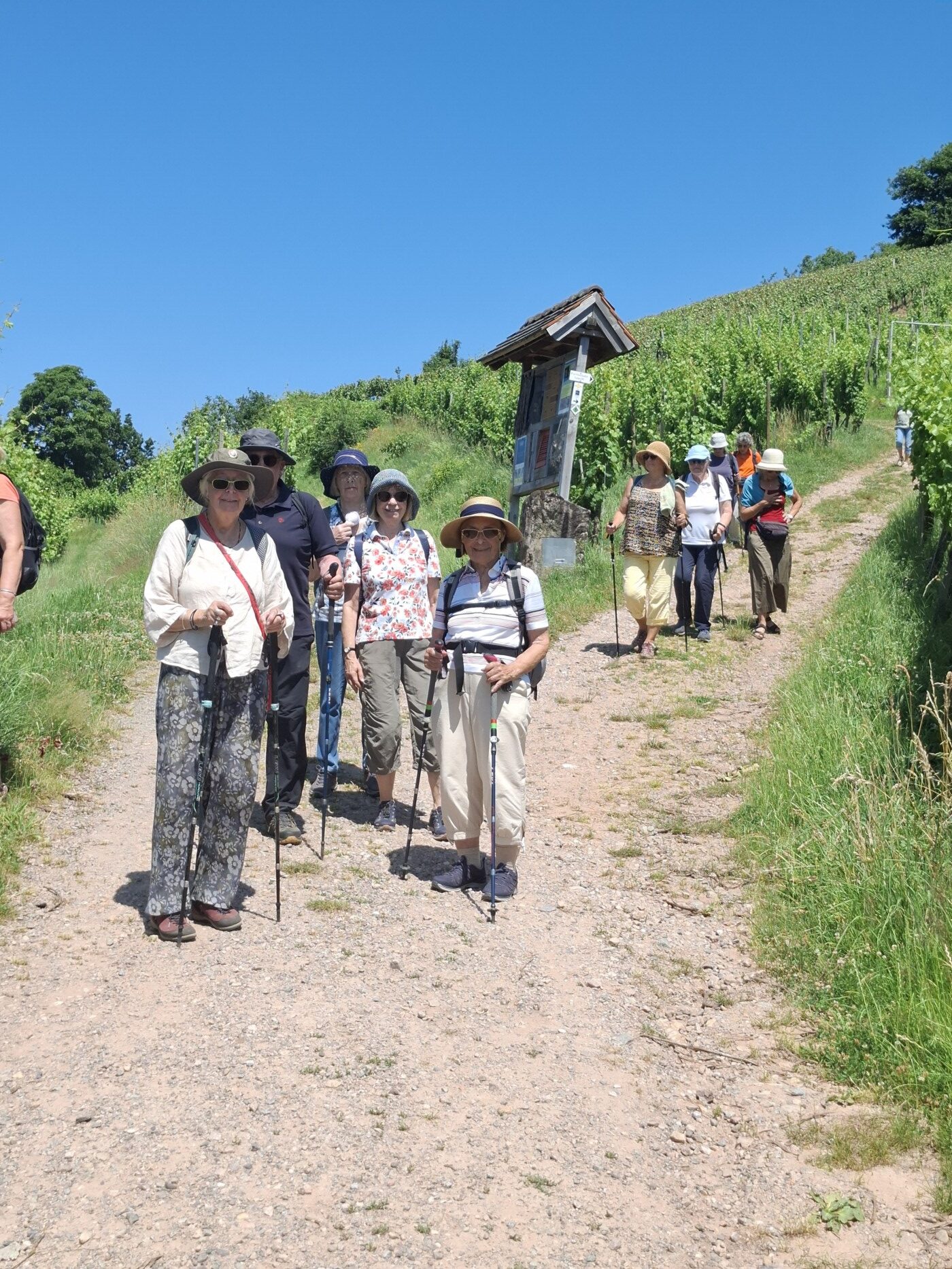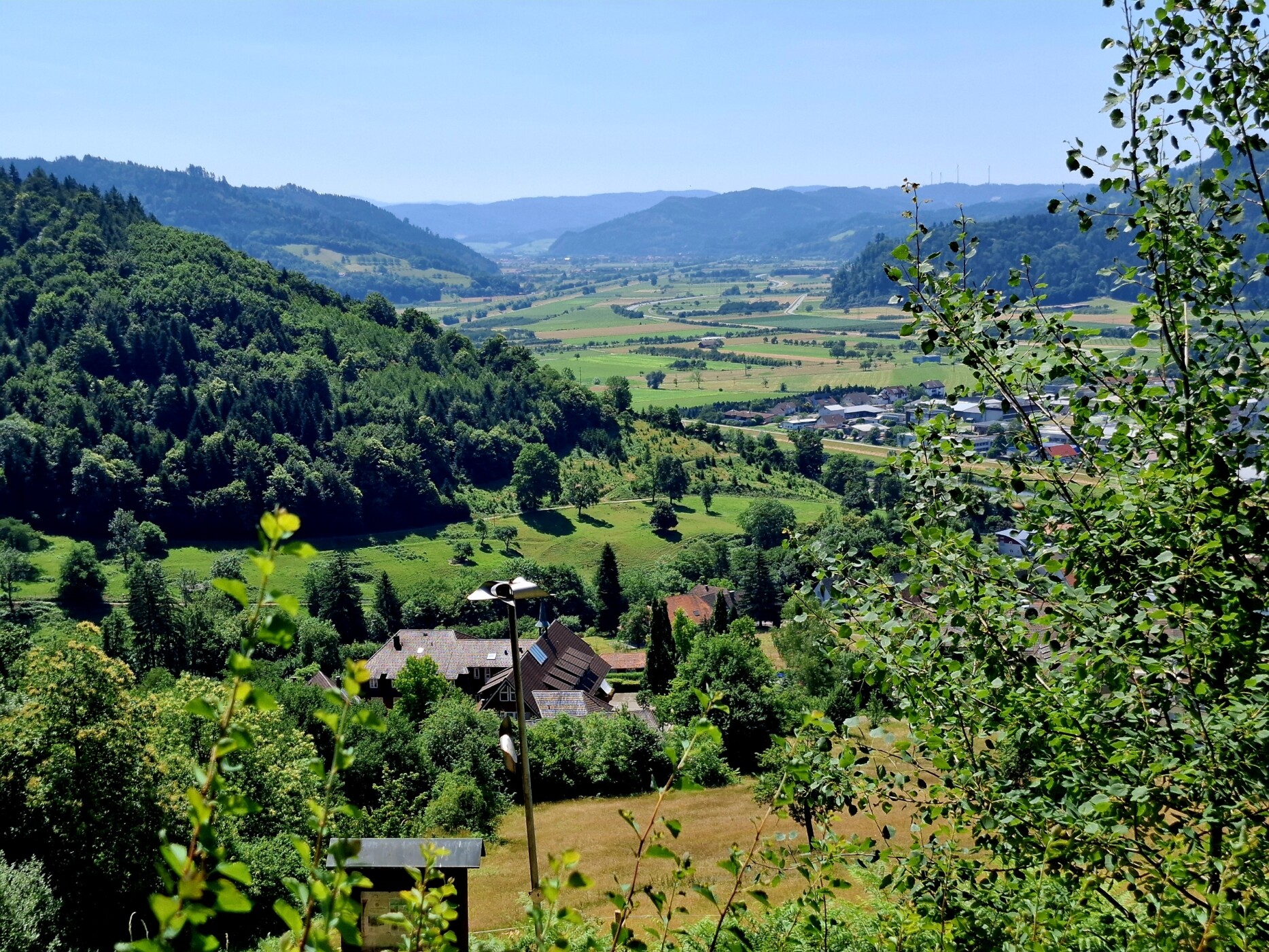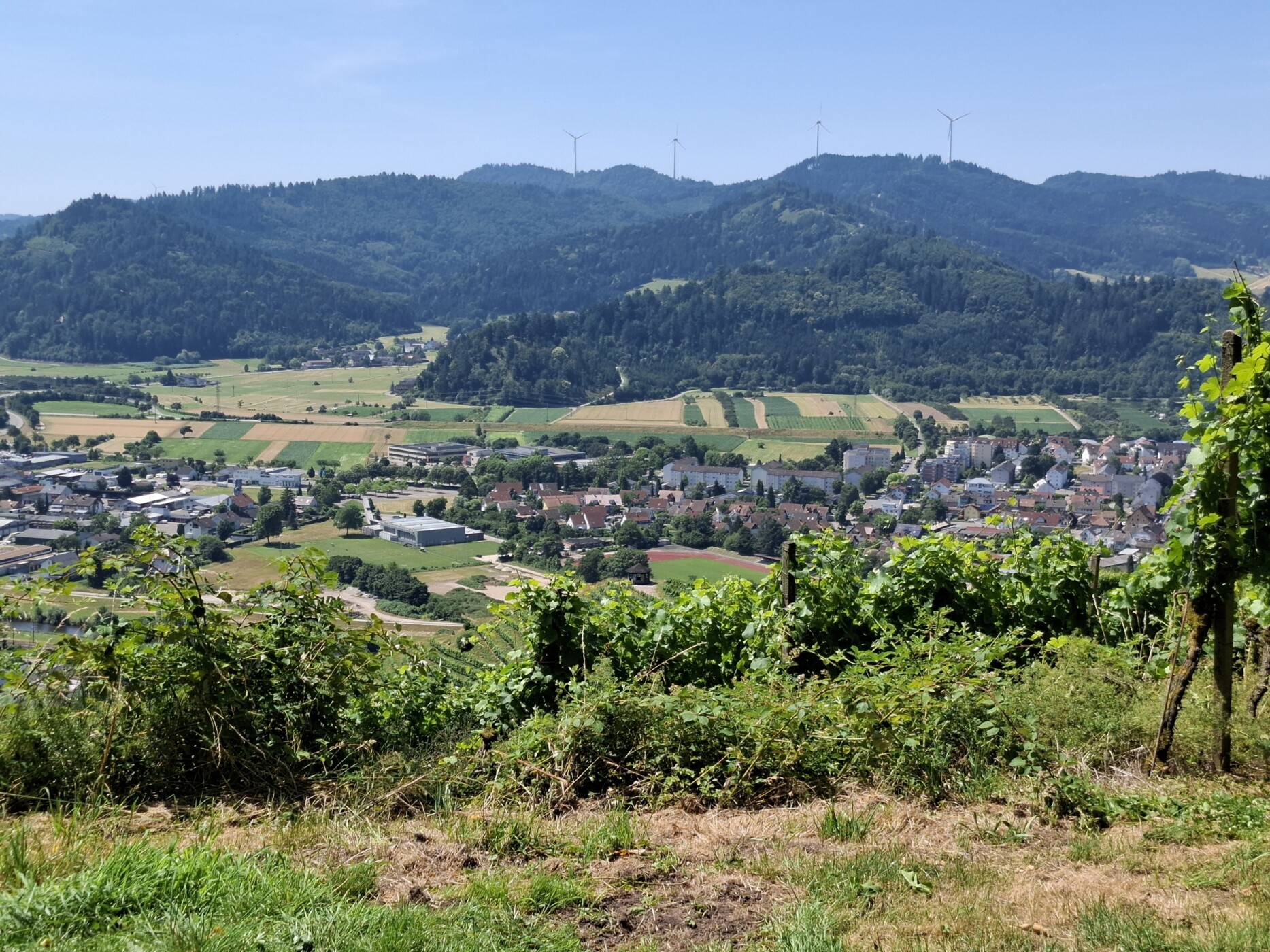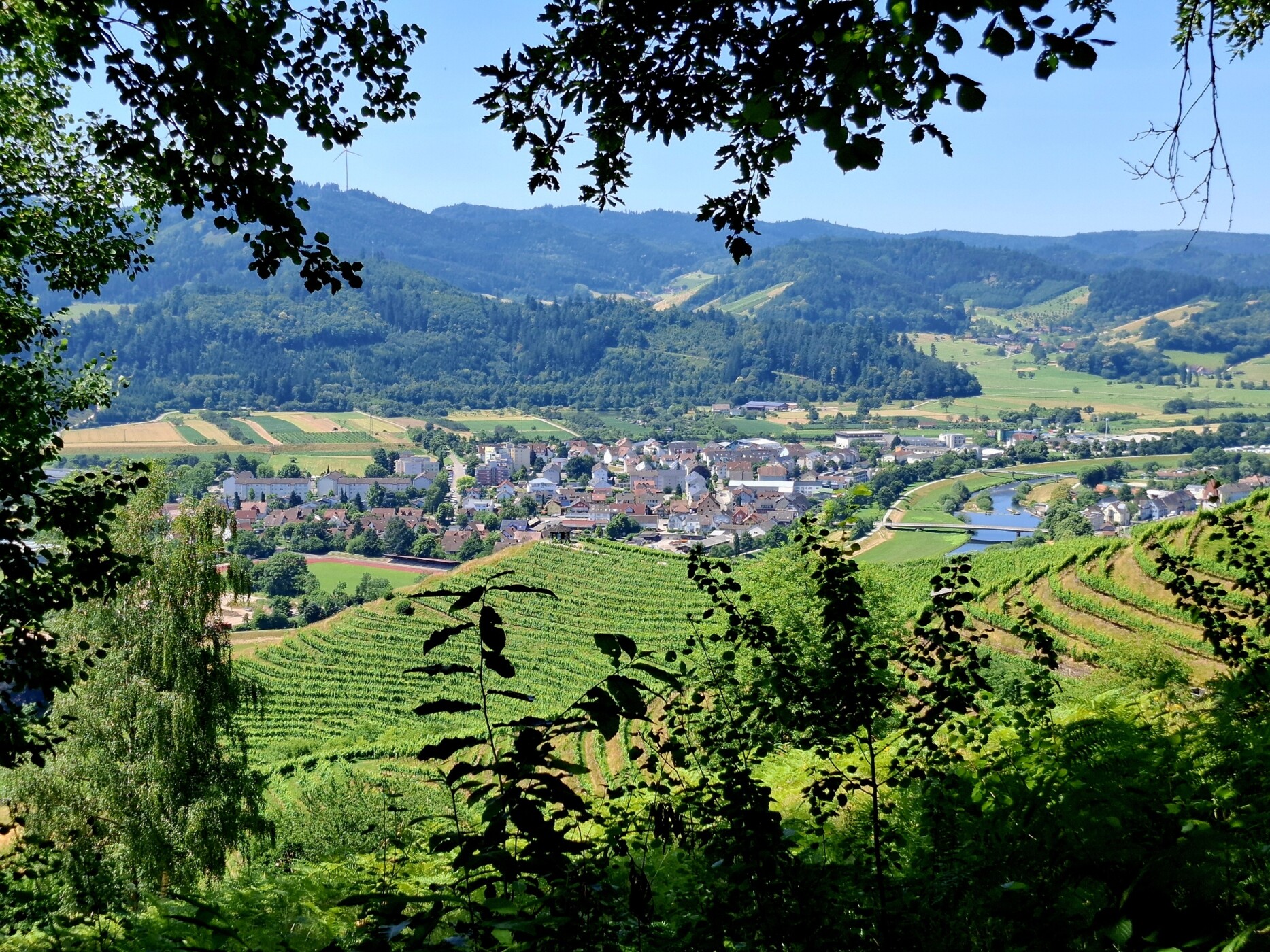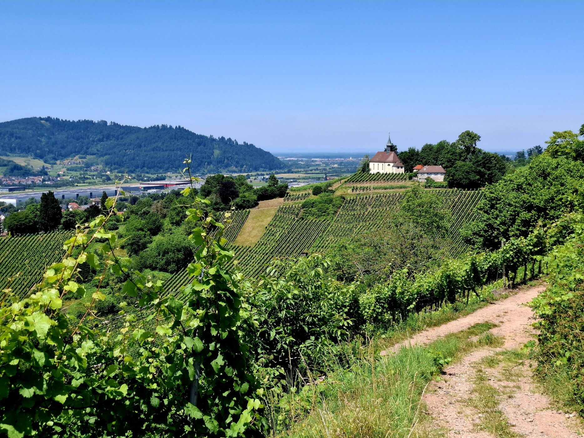 Gleich am Anfang ging es an der Martinskirche vorbei auf den Kastelberg zur Jakobskirche. Der wechselnde Blick auf die Stadt war schon beim Anstieg eine Freude. Von oben konnte man dann weit ins Rheintal und ins Kinzigtal sehen. Auf schattigen Wegen, die aber immer wieder „Fenster“ hatten, um in die Landschaft zu schauen, führte uns der Weg hinauf zur Portiunkula-Kapelle der Franziskaner. Zuvor hatte Charly Koehler im Baumschatten den idealen Picknickplatz mit Ausblick entdeckt, der sofort akzeptiert wurde. Anstrengend und heiß war der Abstieg von der Kapelle durch die Rebberge in die Stadt.
