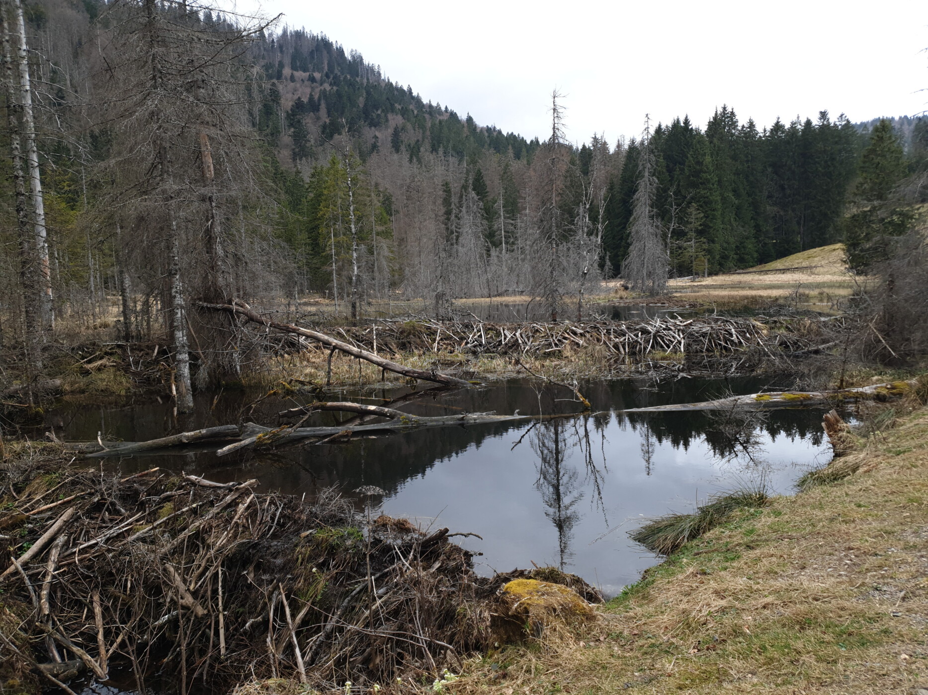 Startpunkt der Wanderung war nach Anfahrt mit der S-Bahn der Bahnhof im Bärental. Zunächst passierten wir den Adlerweiher und folgten der gelben Raute zum Wanderparkplatz Kunzenhof. Danach wechselten wir auf den Feldseeweg. Auf diesem Weg hat sich der Biber zwei Reviere erkämpft. Auffällig angenagte Stämme und aufgetürmtes Holz im Wasser weisen auf geschickte Baumeister/Architekten hin. Biber waren lange Zeit im Bestand bedroht und erobern sich neue Lebensräume.