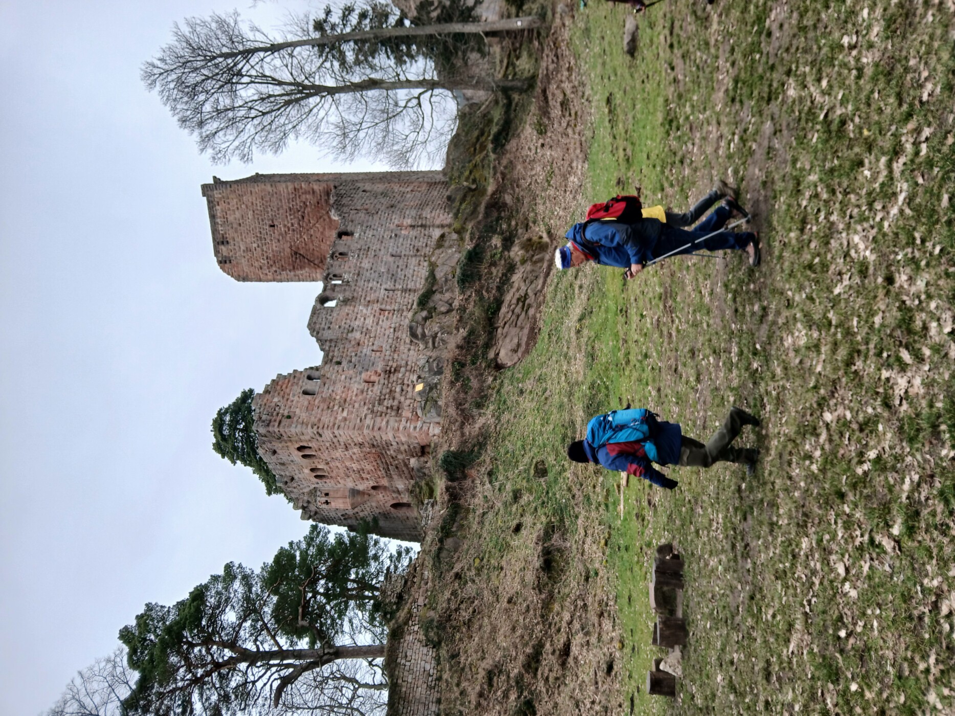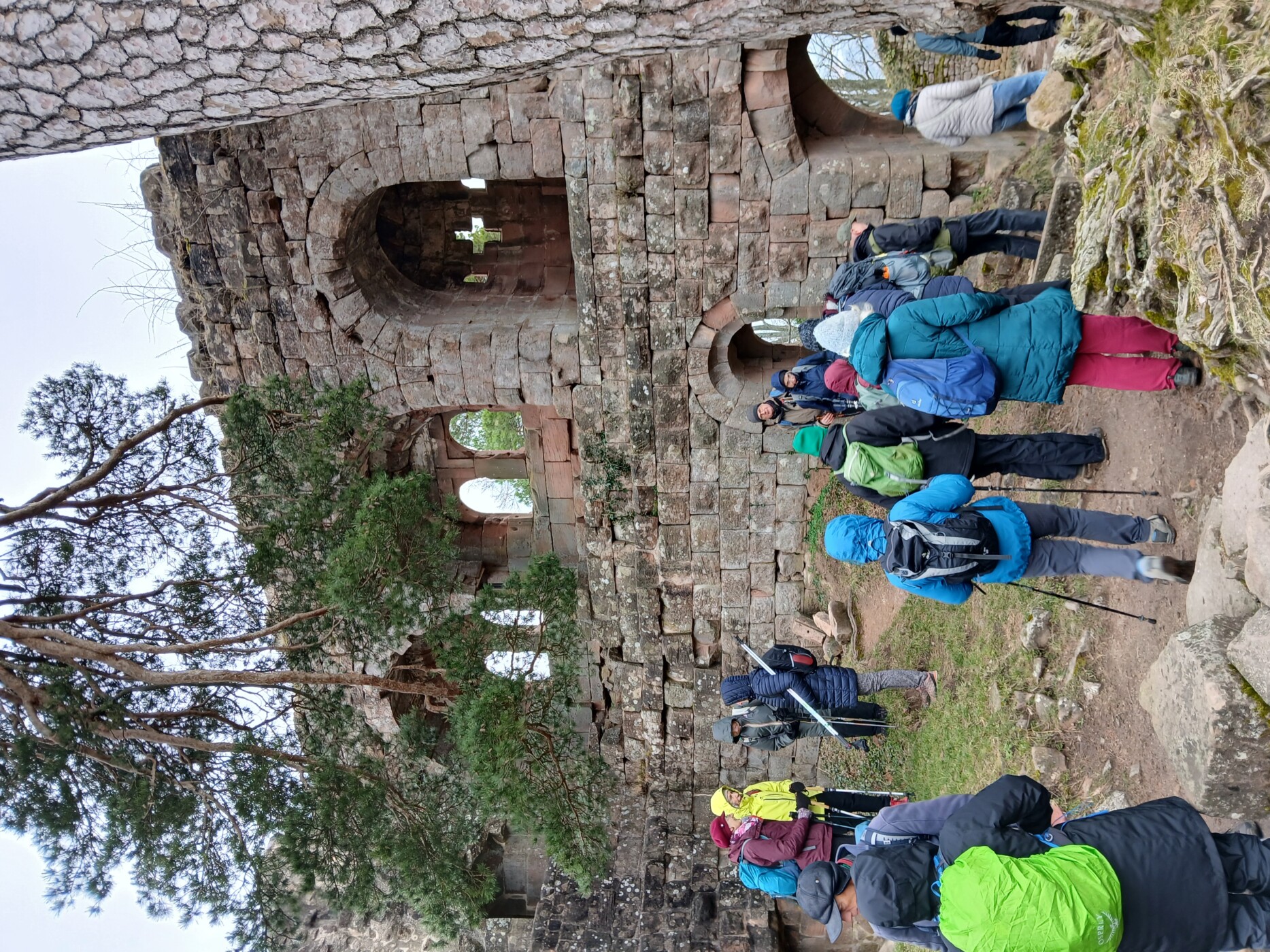 Das Kamel spielt auch bei unserem nächsten Ziel, der Ruine der Jakobskapelle, wieder eine Rolle. Höhepunkt der Wanderung war die Ruine der Burg Landsberg, einem eindrucksvollen Komplex aus drei Burgen innerhalb einer Schutzmauer. Hier haben wir bei guter Laune, immer auf der Suche nach Schutz vor dem eisigen Wind, unsere Mittagspause gemacht.