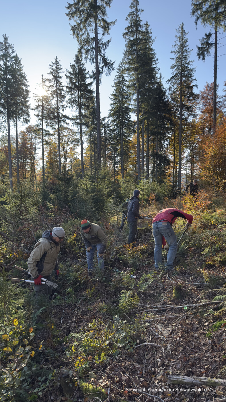 Das stark gefährdete Auerhuhn hat im Schwarzwald das wichtigste seiner Restvorkommen in Deutschland. 2025 wurden hier noch 103 balzende Auerhähne gezählt (auerhuhn-schwarzwald.de). Auerhühner brauchen, nicht nur zur Balz, freie Plätze inmitten eines lockeren Baumbestands.