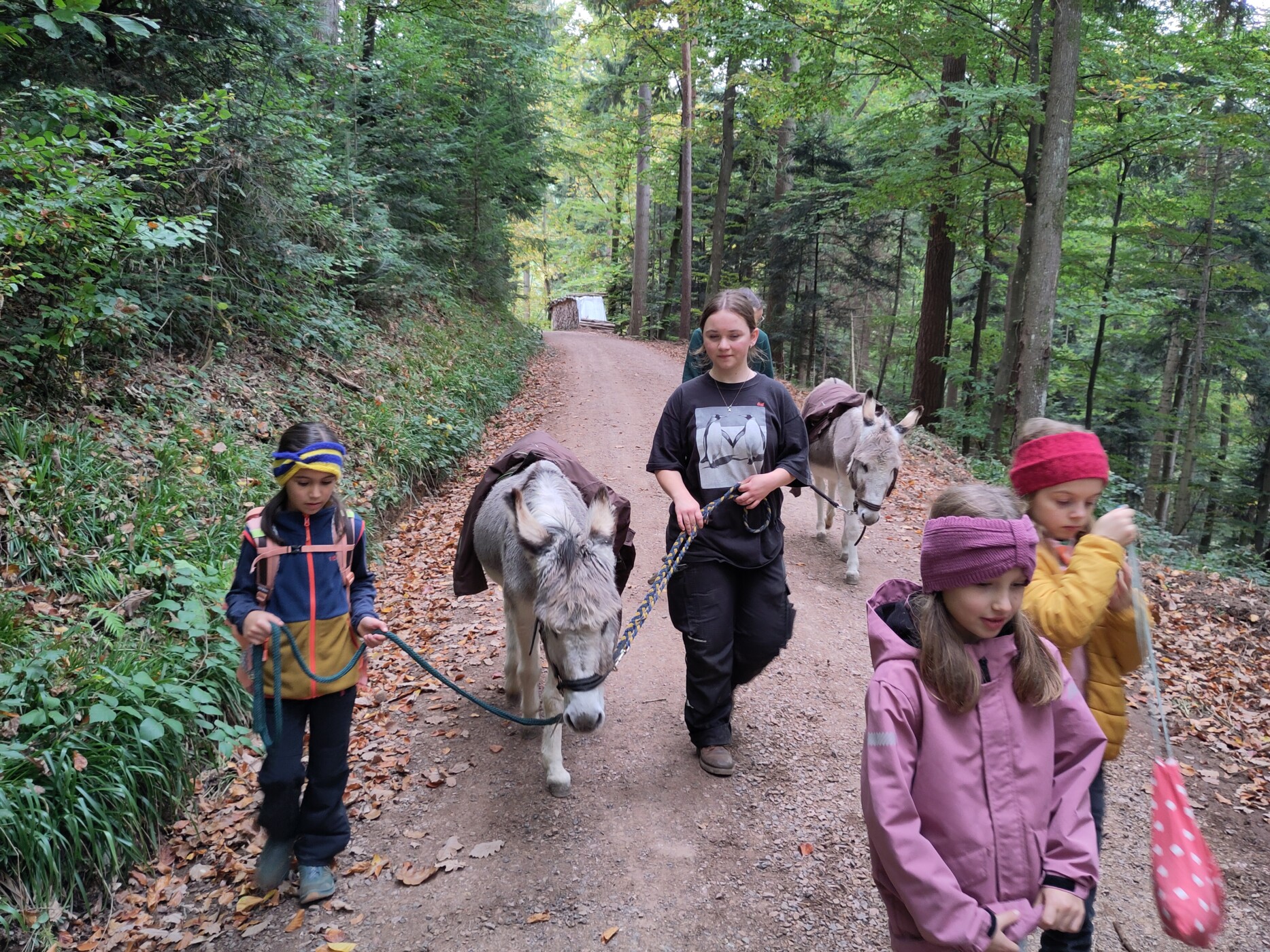 Nach der Begrüßung und einem gemeinsamen Lied ging die Wanderung durch den angrenzenden Stadtrainwald los. Dabei durften die Kinder abwechselnd in Begleitung der drei Tierpfleger:innen die Tiere selber führen.