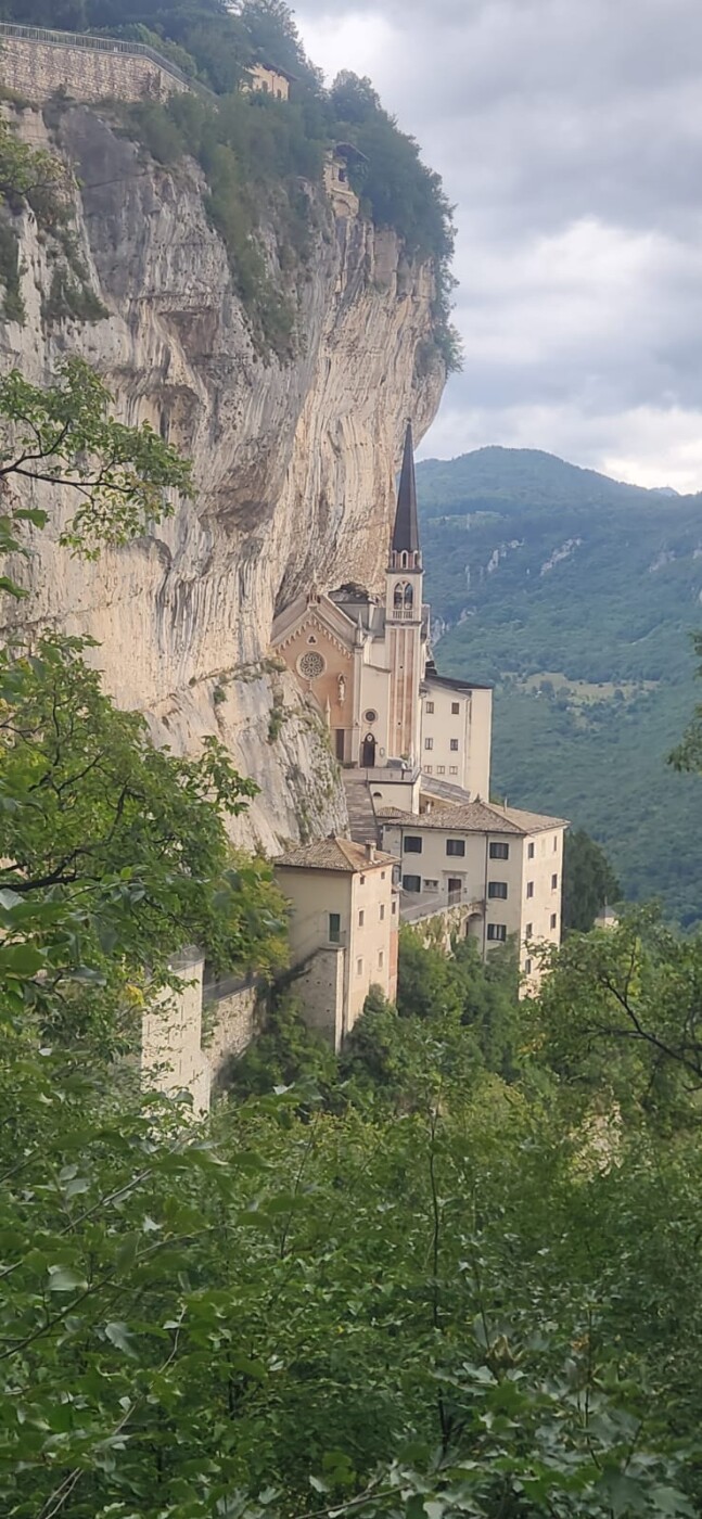 Der Montag führte die Gruppe ins Etschtal nach Spiazzi. Ein Weg mit vielen Treppenstufen geleitete hinunter zur Wallfahrtskirche Madonna della Corona. In schwindelerregender Höhe (774 m) an eine senkrecht abfallende Felswand gebaut, war es ein spektakulärer Anblick und das Glockengeläut weit ins Tal hörbar. Nach Besichtigung der Kirche ging es zurück nach Spiazzi und mit dem Bus nach Garda. Dort fand der Nachmittag Ausklang bei leckerem Eis und Cappuccino.